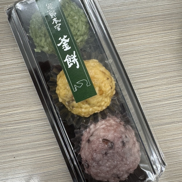散策後。前日、道の駅「奥熊野古道ほんぐう」で買った「熊野本宮釜餅」(よもぎ)があまりに美味しくて、お店へ直接買いに行くことにしました。熊野鼓動さんというダジャレのような名前の会社です。販売所はお店というより、事務所です。行かれる方は、写真中央の引き戸を勇気を持って開けてください。