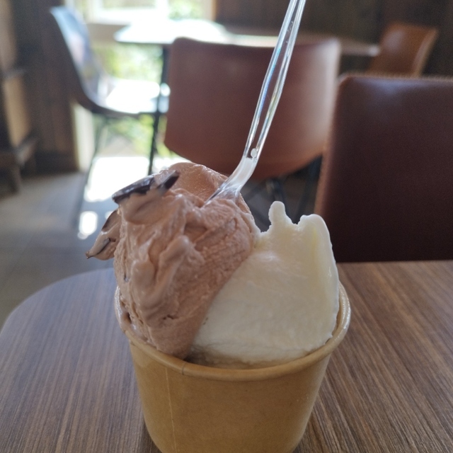 湯上りに原村にあるジェラート屋さんへ。ここもテラス席があり、わんこOK。