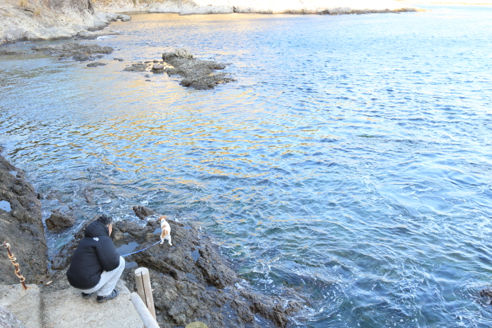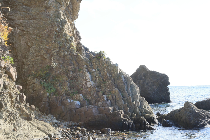 満潮で近づけなかったけど、この斜めった柱状節理の先に、放射線状に広がった柱状節理があるらしい。次は干潮の時に行こうと思う。潮の満ち引きまで意識してなかった。楽しみはまた今度。