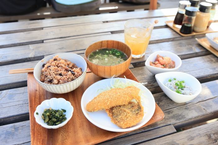 ランチはこれ。とても美味しい。フライも美味しいし、あおさたっぷりのお味噌汁。おさしみのづけ、しらすもいいし、酵素玄米がもっちもち。