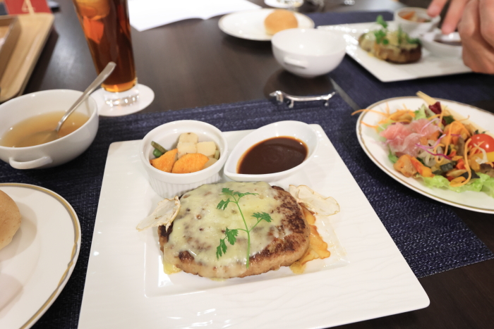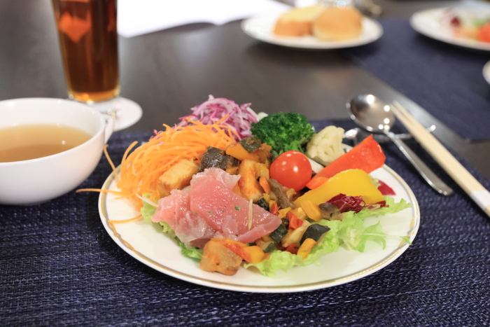 ハーフビュッフェスタイル。前菜やサラダ、スープ、デザートはビュッフェ。皿が小さいのよ。21cmサイズで乗り切らん!24cmか27cmが欲しい。野菜はもりもり取りたい私です!