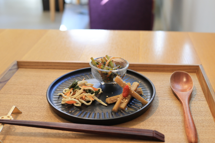 前回と同じ、一汁三菜の薬膳御膳。前菜から幸せ。干し豆腐、間引き大根のキムチ、ゴボウの胡麻和え。干し豆腐好きなんだよね。今度買おうと思う。