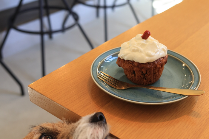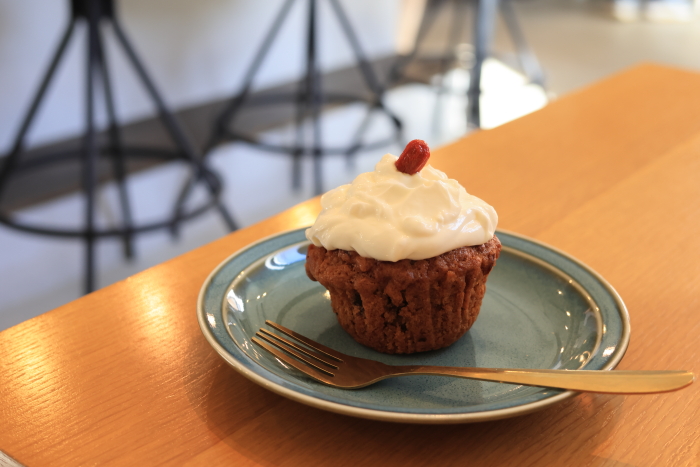 酸味あり、甘さも僅かにあるヨーグルトみたいななめらかさのフロスティング。中にクルミだけでなく、松の実も。甘さはナツメで自然な甘み。生地自体は甘さがかなり抑えられている。お店の方が甘い生地が嫌いみたいで、ナツメを生かしてるってお話されていた。薬膳とキャロケの融合、すごいと思った。こういう考え方、勉強になる。犬用のおやつを作る時に参考にしようと思う。