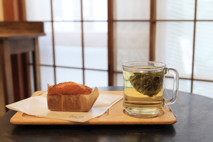 シンプルな見た目。味は軽いフィナンシェ。とても美味しい。ドリンクは阿里山高茶。茶葉たっぷりで美味しい。烏龍茶が飲めるとは思ってなくて、それもうれしいな。