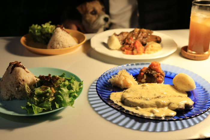 お酒頼まなくても、世界の家庭料理、定食?みたいなものが頼めるのがここのお店のいいところ。今回はイタリア料理、ゴルゴンゾーラソースがかかった豚肉のソテーにした。ゴルゴンゾーラって不思議で最初はゴルゴン!って思うんだけど、だんだん慣れてきて、普通にチーズとして食べる。美味しくて何より。そして、犬連れにやさしいのもうれしい。店員さんがいい感じの距離感で接客してくれる。今回リピート2回目。