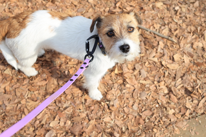 お里のわんこと代々木公園でパックウォークしたよ。ご覧の通り、ルルは他のわんこの鳴き声にビビってます。