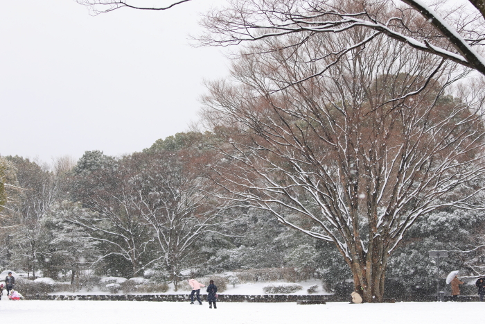東京で雪が積もるのは久しぶり。舎人公園へ行こうって言われたけど、あっちは犬が多そうだから、北の丸公園にしたいと提案。これが大正解。
