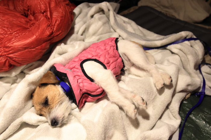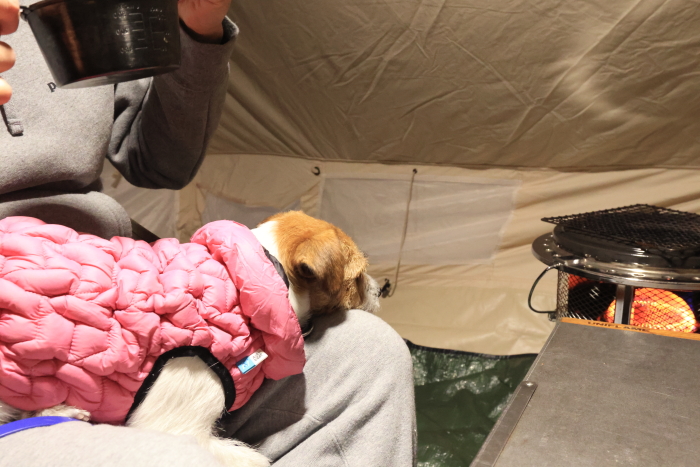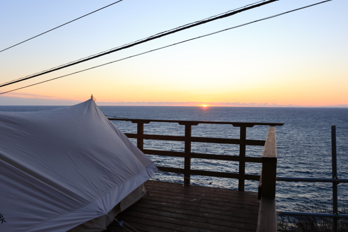 デッキに設営したテント。背の低いものにしたから、吹き飛ばされるみたいなことはないけど、体感温度が低く感じるので、ほぼテントの中にいた。