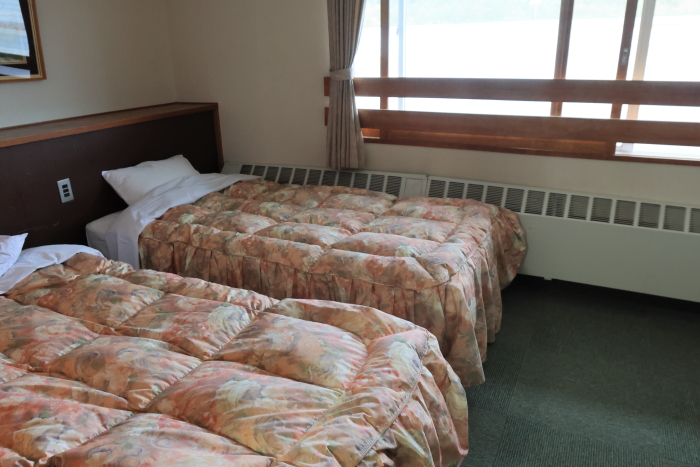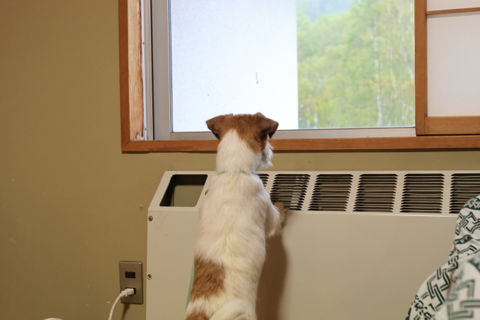 犬が泊まれる部屋は4階の一番端っこ。池が見えない部屋。きっとこの部屋が一番安い部屋で、一般のお客さんが好まない部屋なのだと思う。でも、全然、問題ない。だって、犬が泊まれるだけでありがたいから。池が見たければ、外へ行けばいい。