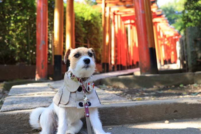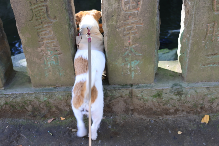 ルルは神社へ行くと鯉を眺めるのが好き。こうやっていつも眺めてる。リードオフにしたら飛び込むのかしら。