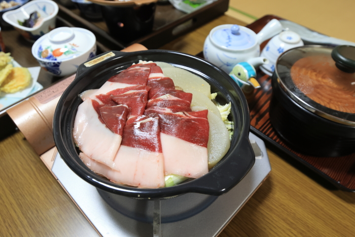 オプションでイノシシ鍋を1人前追加した。サービスで野菜は2人前にしてくれたみたい。小食だから1人前しか頼まなかったのに、ほんと気前良すぎる。それにしてもこの脂、さすがイノシシ。少し脂を食べたけど、甘くて美味しいけど、やっぱり脂だから残しちゃった。赤身の部分、とっても美味しかった。脂好きな人はぜひオプションで頼んでみて。