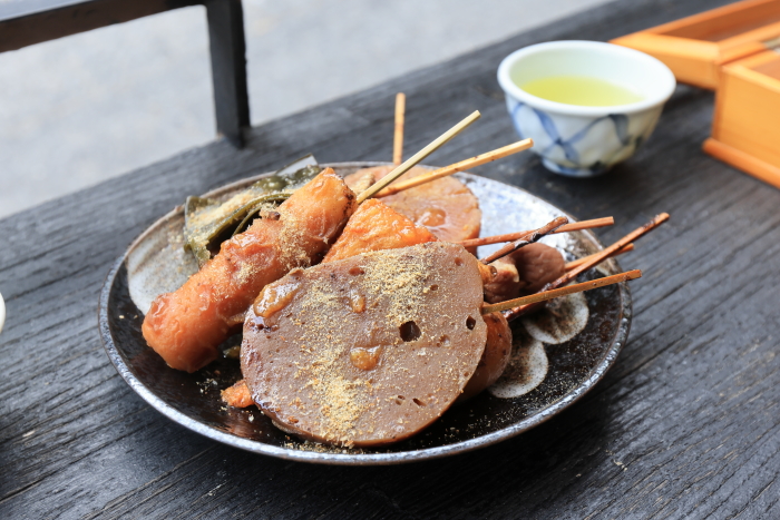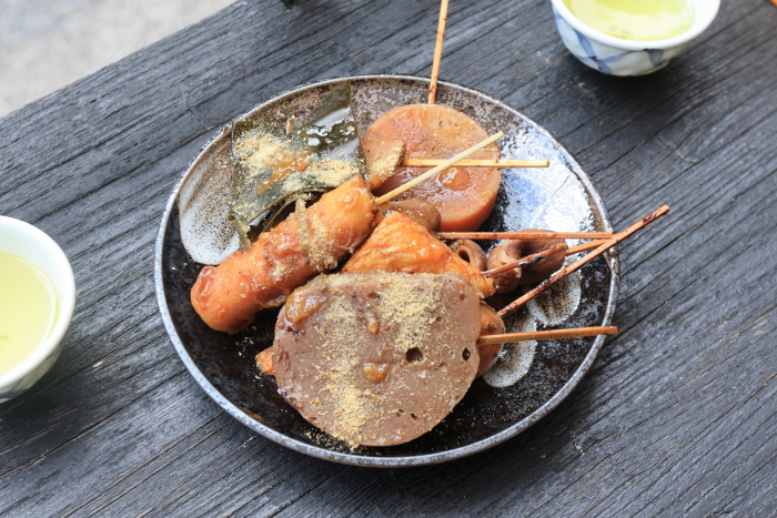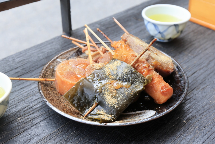 全種類1本ずつ。9本だよ。真っ黒なお出汁に浸かっていて、だし粉をかけて食べるのが静岡のご当地おでん。これがとっても美味しい。