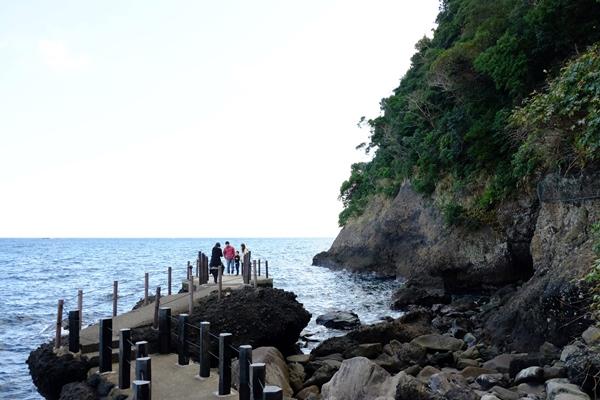 立派な遊歩道が海の中にある。気になったのはこのロープをつなぐ支柱。なぜに六角形なんだろう。柱状節理は六角形だから、それを意識した?いい石材が使われているのも気になる。調べても、そんな情報見つからない。とにかく、立派な石柱なんです!