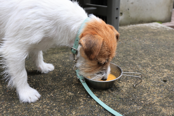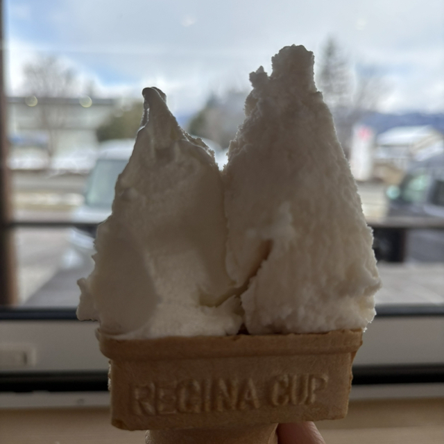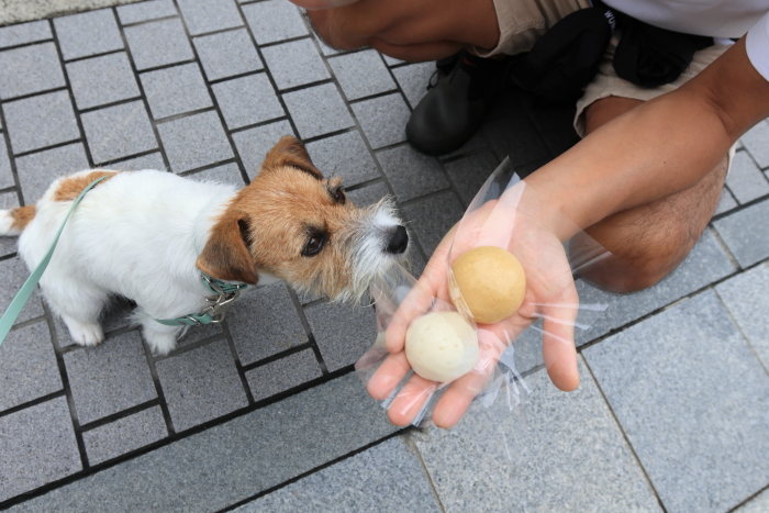 テラス席犬OK!ポポーとりんごのダブル。割とオーソドックスなフルーツしか置いてなくて、物足りないけどポポーがあれば良しとしよう。果物屋さんのジェラートだし、ぜひ季節のフルーツを選んでみてね。間違っても抹茶とかチョコにはしないように。