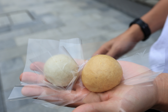 できたて、あつあつ。酒まんじゅうと味噌まんじゅうだよ。