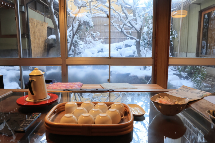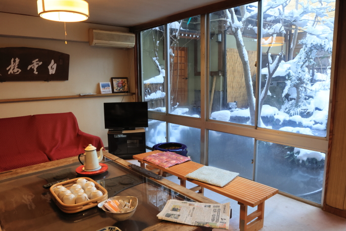 雪見コーヒー、ごちそうさま。旅館の朝ごはんはコーヒーを個室には持ってきてくれないけど、自分でコーヒーの部屋へ行けば無料で飲める。とても良いサービス。この宿の小さな心遣いに感謝!