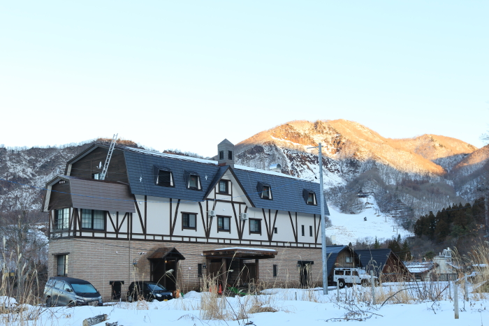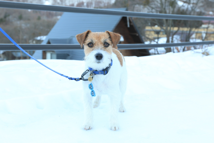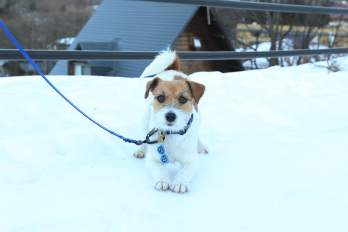 翌朝。ドッグランのある宿だけど、冬は閉鎖。第2駐車場で遊ばせられる。リードはつけたままだけど。