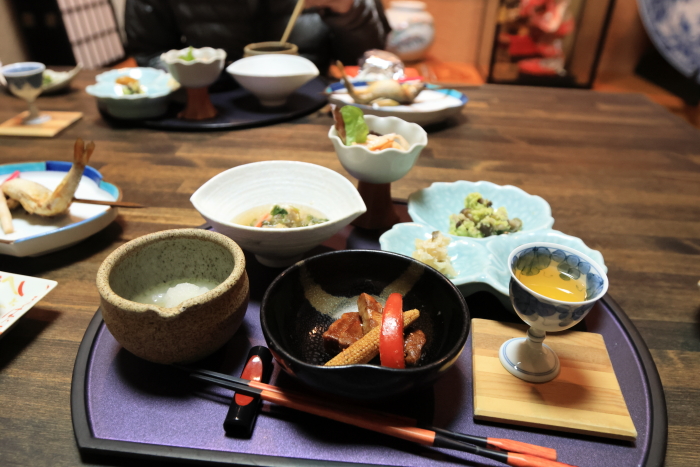 いつものお食事少なめプラン。去年よりさらに1品減ってた。物価が高騰してるんだもの、仕方ないよね。去年はこれに芋煮が付いてたんだけど、それがなくなった。