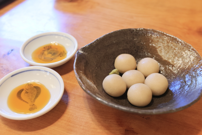 前菜的に頼んだつもりの、そば団子のわさび醤油はデザートとして運ばれた。メニューにそば団子のあんこがあって、そのページと同じところに書いてあったから、お店的にはわさび醤油もデザートなのかも。でも、でも、言いたい!これはメインを食べる前に食べた方がいい。だから、もし注文するなら、そば団子のわさび醤油は先に出してと頼もう!美味しいのに、食後だからお腹いっぱいであんまり楽しめなかった。待ってる時間が長かったから、お団子を先に食べたかった。