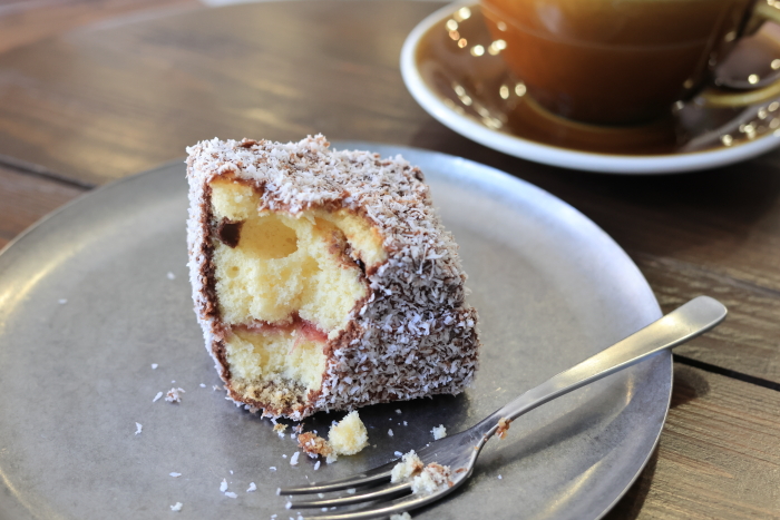 おぉ、やっぱり中身が変わった!中にフルーツソースが入った。店長さんに聞いたら、フルーツソースが入っているのが本国の一般的なラミントンらしい。これはいい!素敵なバージョンアップ。値段も変わらずに、ひそかに改良してるなんて。