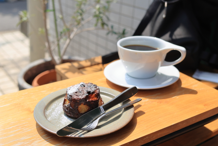 デカフェはまぐたっぷり。選んだ焼菓子はファーブルトン。フランスのお菓子。「カヌレのいとこ」とも呼ばれていて、カヌレみたいな香ばしさとプリンみたいな味。もっちり食感。グルテンを立てずに生地をまぜているから、もっちりするらしい。