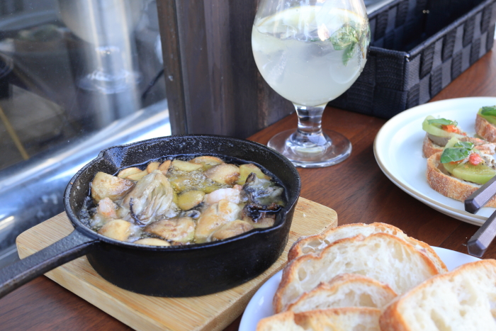 ぐつぐつのアヒージョ。大きな書きが2つ。海老やマッシュルームなど。濃い目の味付けで、ビールに合うらしい。私は濃いな!と思ったけど。