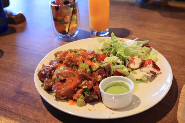 多国籍カフェで、何でもある。私はアヒポキ。見た目、こんなんだし、期待してなかったんだけど、思いの外美味しくてびっくり。マグロが赤身ではなく、中トロも含まれていて、豪華だったわ。アボカドソースもワサビ入りでピリ辛。