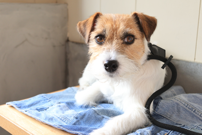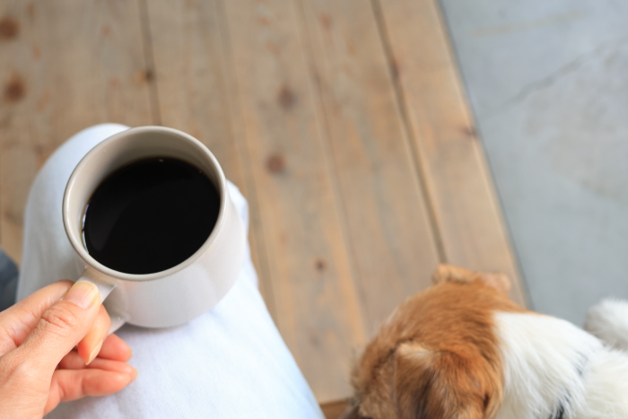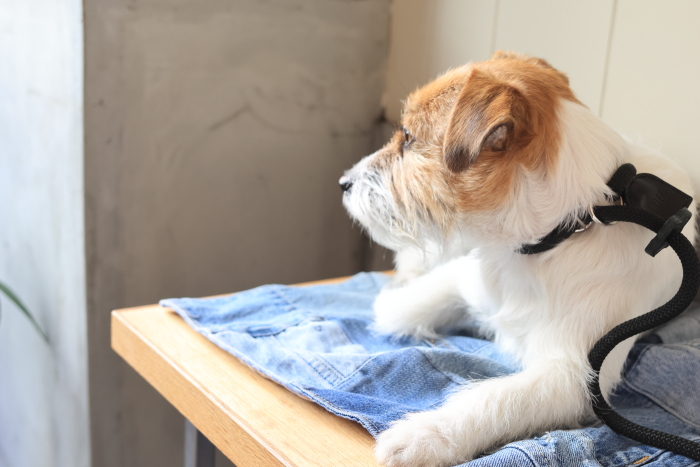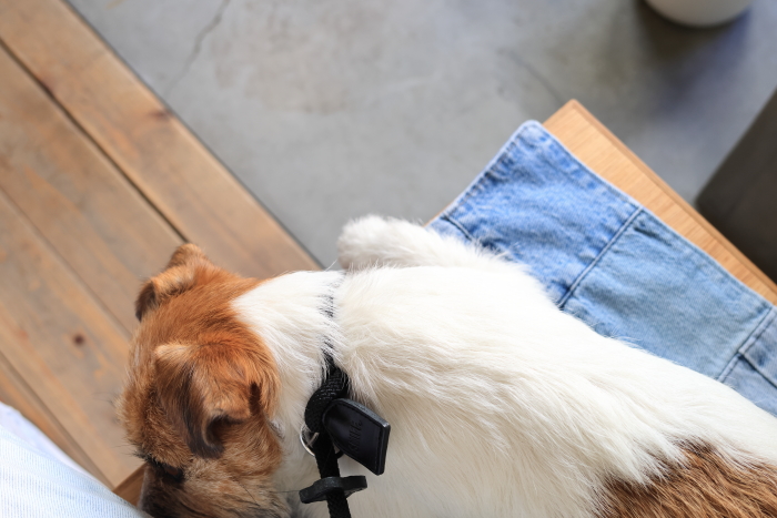 店内は抱っこで入店。入り口のベンチの端っこが犬OKの席。