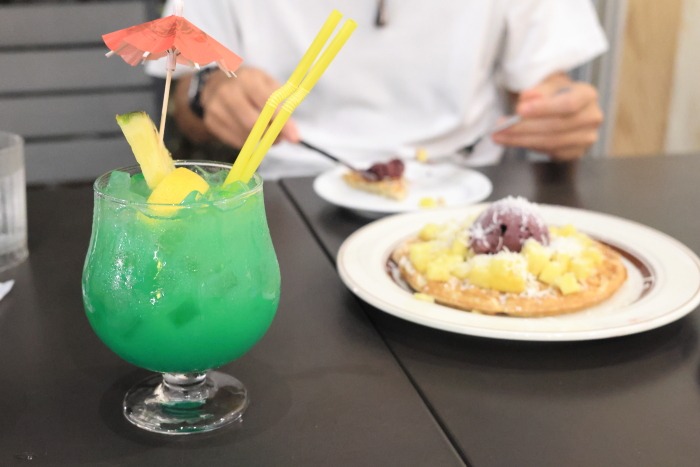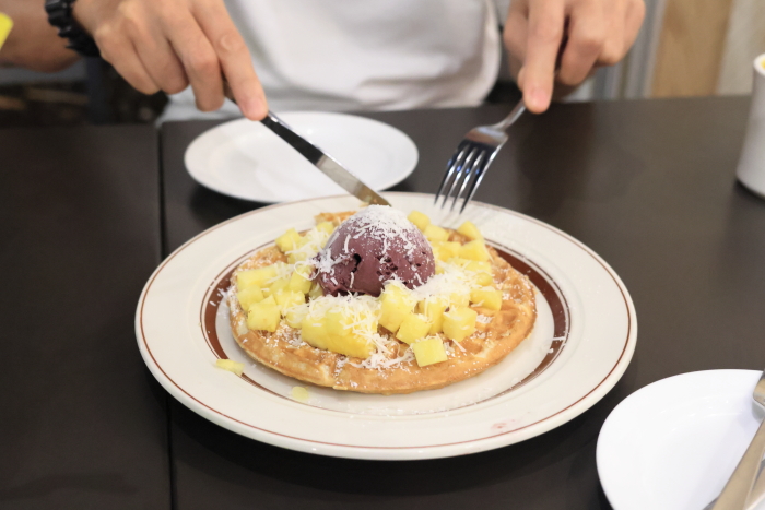 けど、よくメニューを見てみたら、ココナッツのシンプルなワッフルがあったから、それをカスタマイズした。アサイー、パイナップルをトッピング。これなら美味しく食べられる。