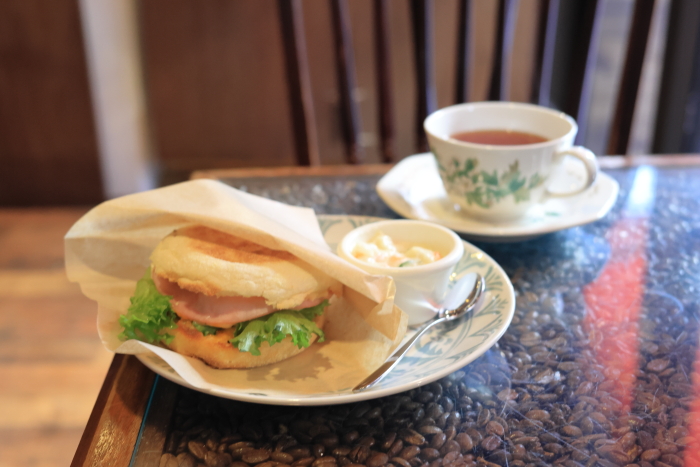 モーニングはイングリッシュマフィンはハムチーズのみで、ドリンク込み950円。新宿という場所、店内犬連れOKっていうのも助かる。