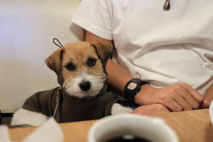 犬連れ席は店内の奥の方っぽい。前回もこの辺りだったから。手前の目黒川が見える明るい席がいいなぁと思いつつ、店内は入れるだけで感謝。