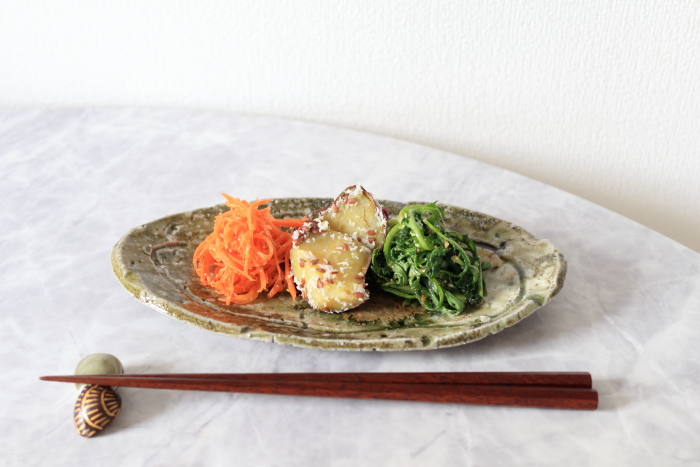 作り置きのおかずを盛り付けてみたよ。オーバルって本当に使いやすい。オーバル皿を2~3年ほど探し続けてたから嬉しいな。