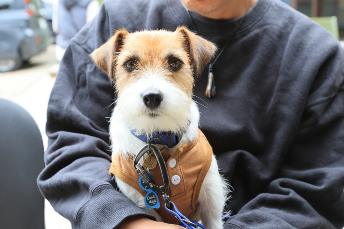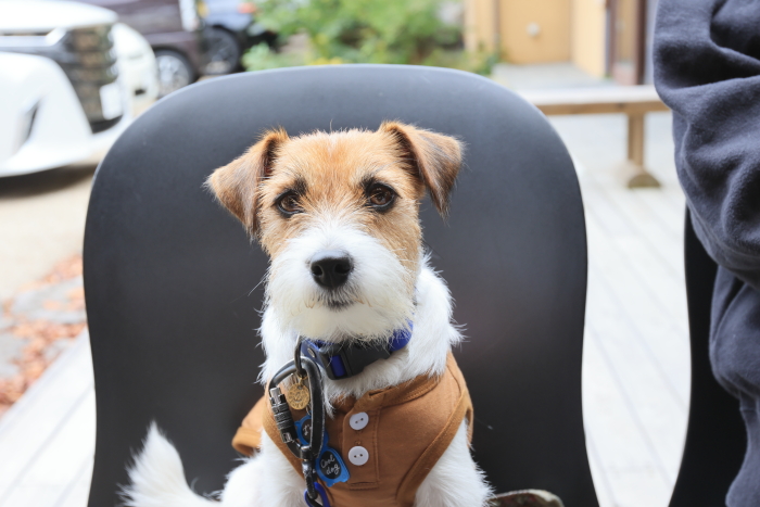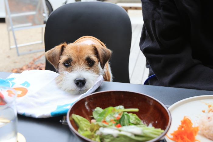 少し寒いけど、トレーナーで平気。私はロンT1枚だった。けど、犬連れではないお客さんは寒い!寒い!と言って、店内へ移動していった。薄手のダウン着てた女性。冷え性かな?我が家を真似してテラス席に座るからだよ。うち、キャンパーだから寒さに強い!