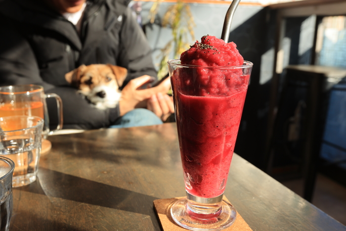 ヴィーガンやグルテンフリーってのはすごくいいんだけど、サンドイッチ系が中心だったので、ちょっと食べたいなって思わず、私はスムージーだけにした。注文してから作ってくれるので、はちみつなしで作ってもらった。これが正解だった。さっぱりしていて美味しかった。ビーツとバナナで十分甘い。