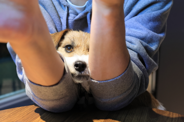 ルル、腕で挟んでる。
